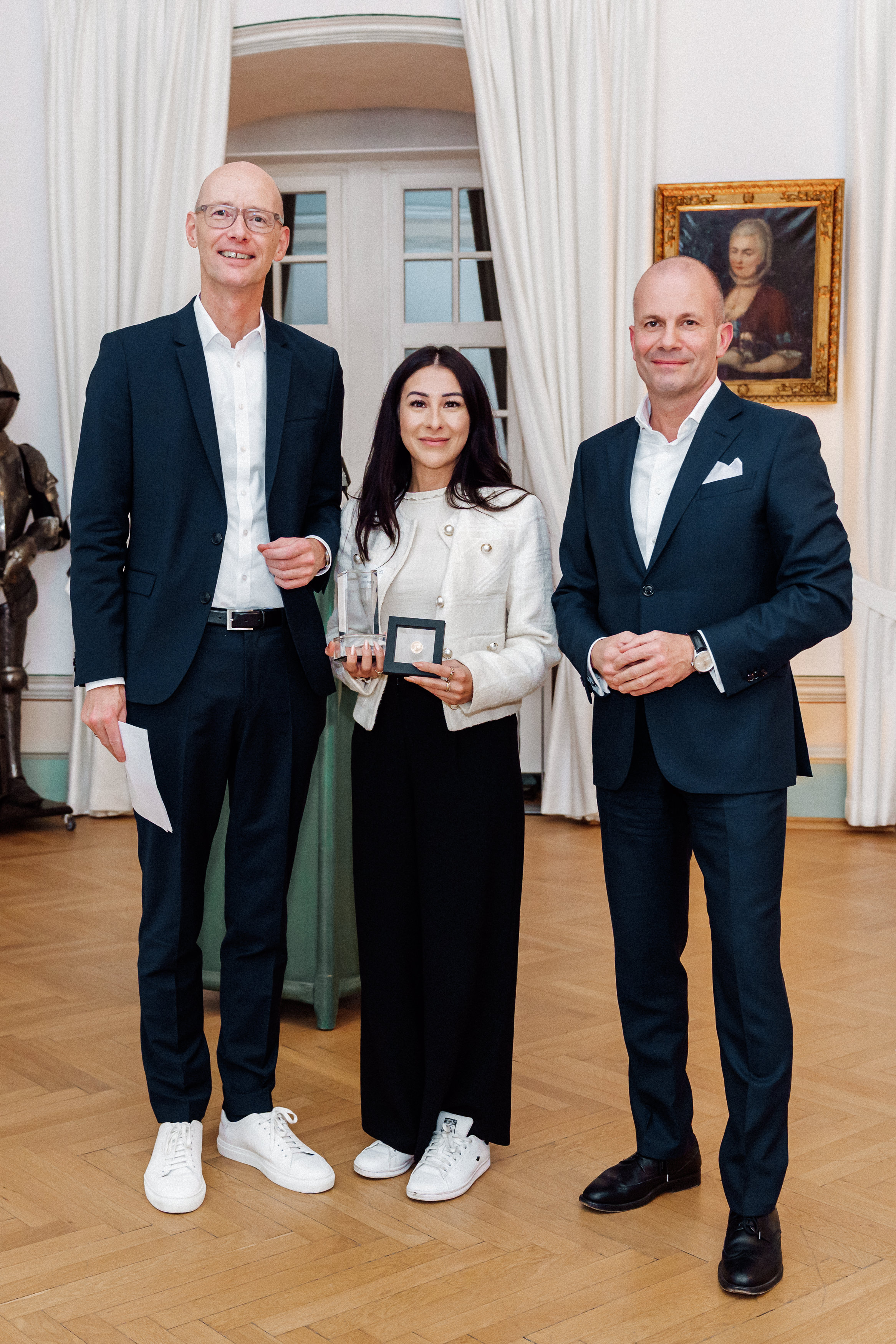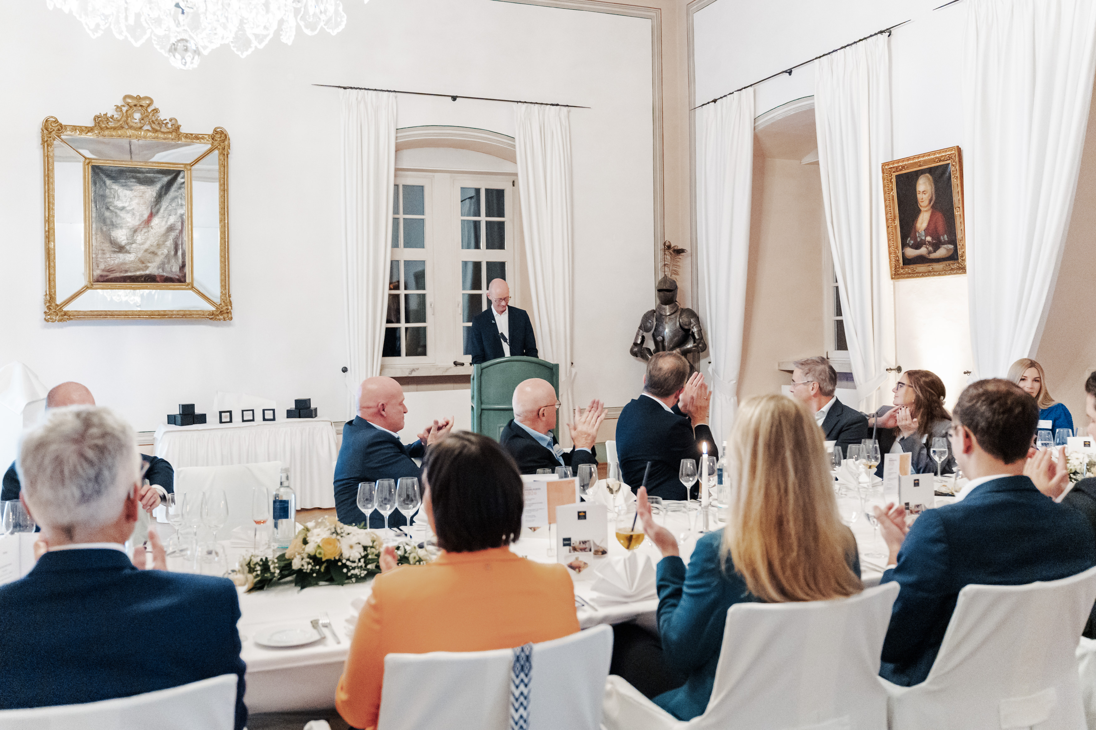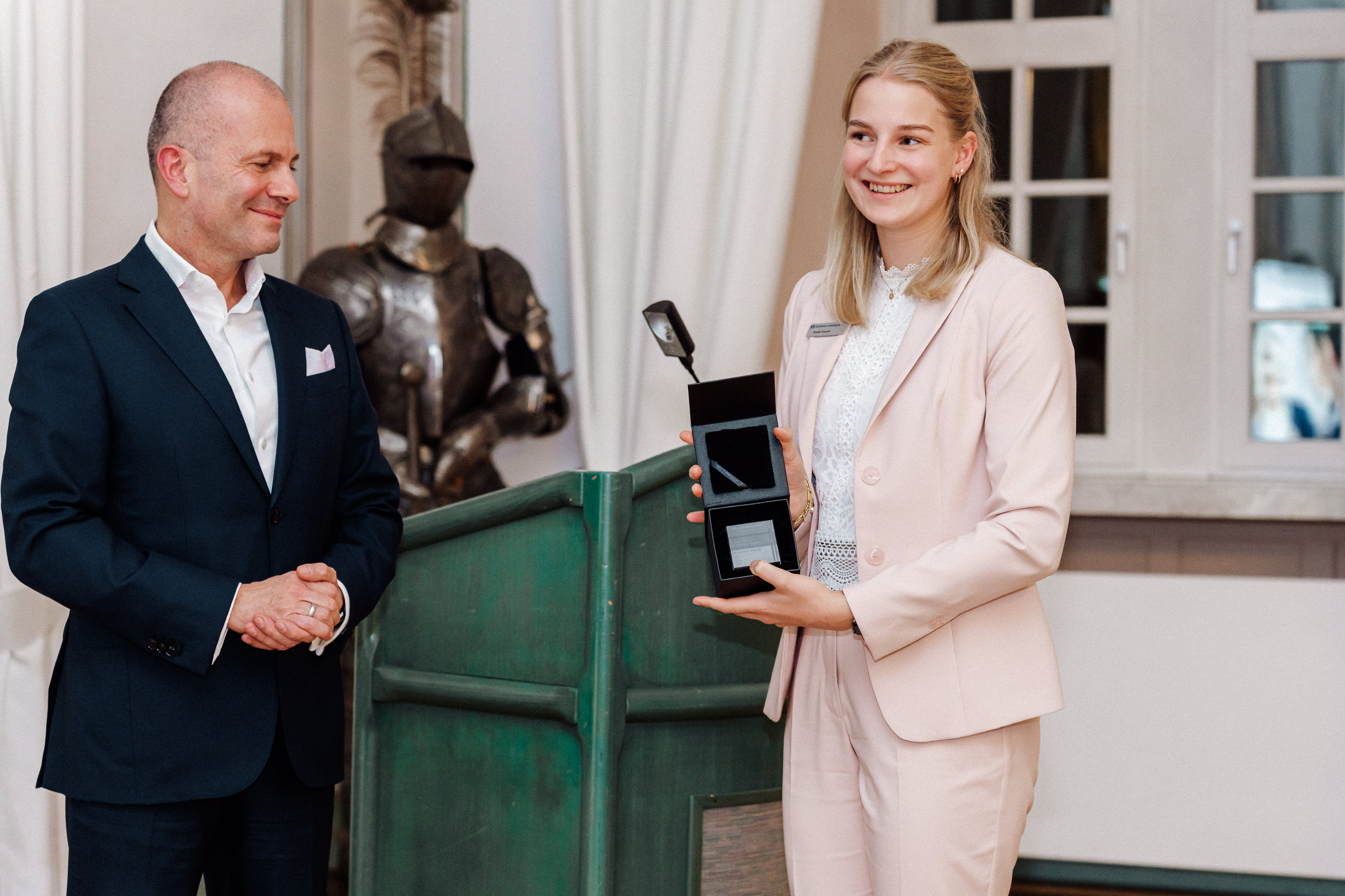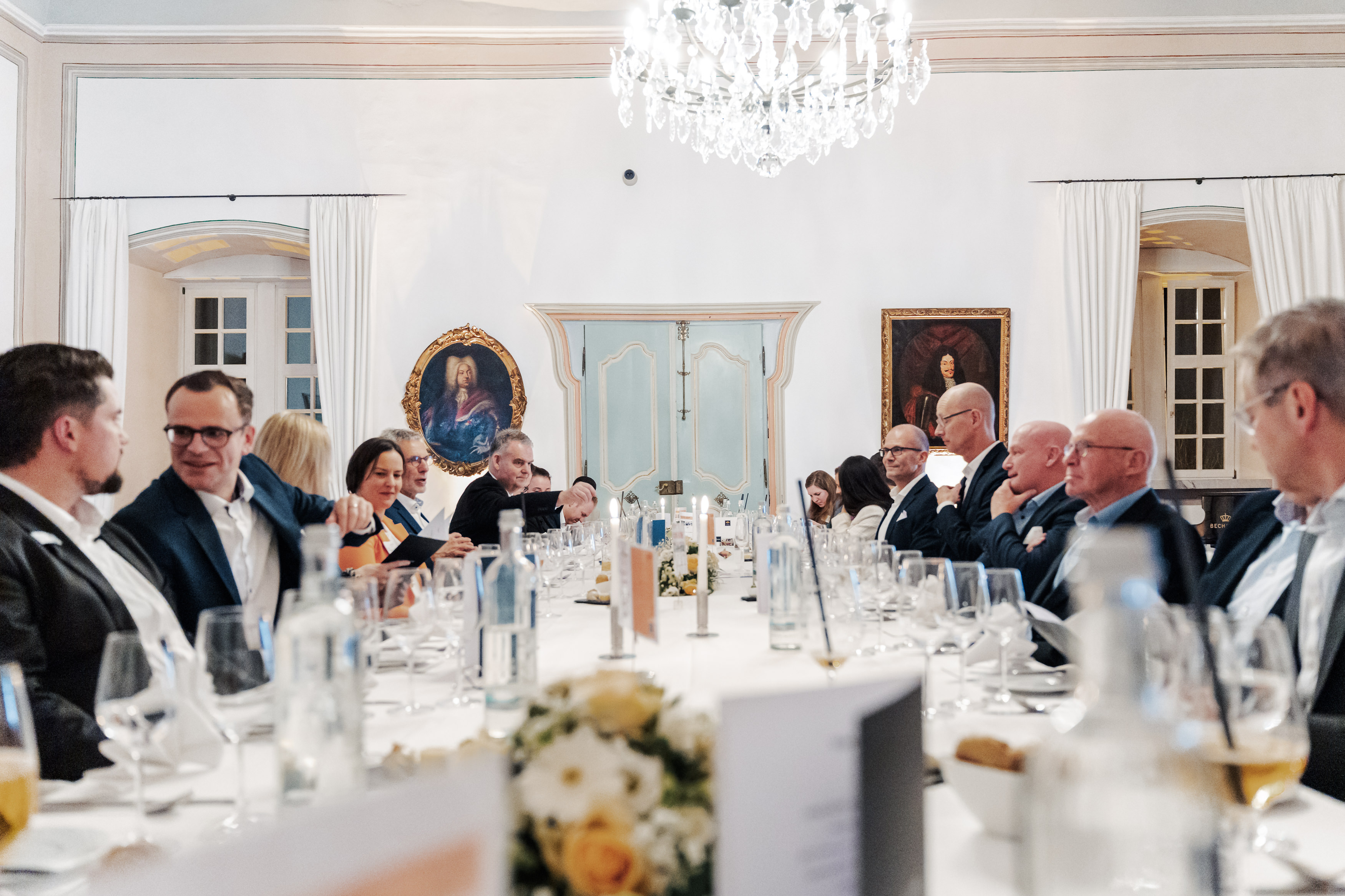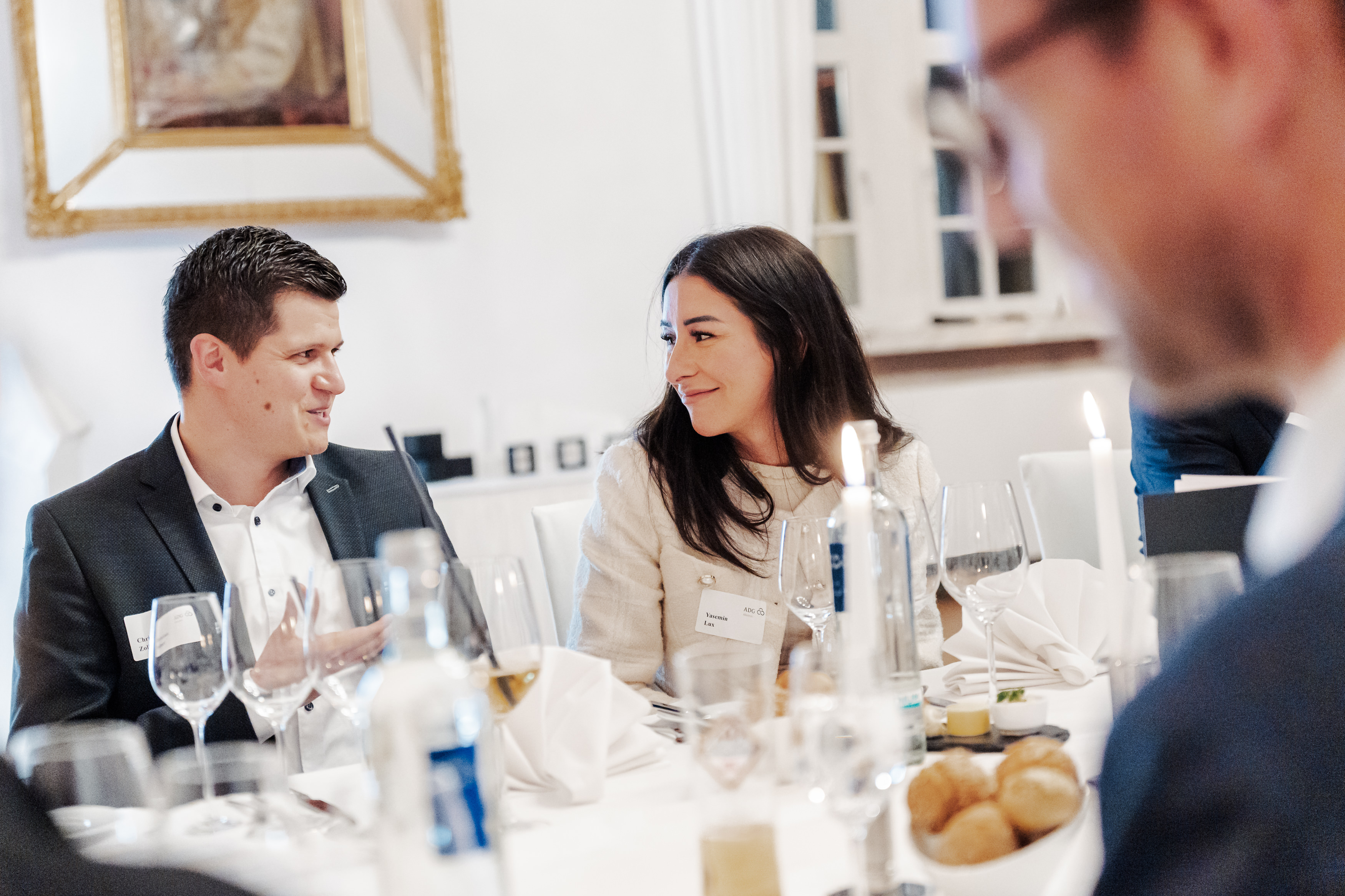 Die Jury – Peter Rausch (Vorstand ADG), Thomas Lurch (Bereichsleiter Union Investment), Christoph Stumm (Geschäftsführer ADG Business School) und Malte Ringsdorf (Geschäftsführer ADG Alumni) – hörte genau hin. Und fand: Dabeisein ist alles. Aber drei Arbeiten haben sich am Ende doch ziemlich eindeutig hervorgehoben. Das sagte auch Peter Rausch am Abend, als er die Gäste an der langen Tafel im Rittersaal begrüßte – mit einem Augenzwinkern Richtung Olympia: „Dort gibt’s nur einmal Gold. Bei uns heute dreimal."